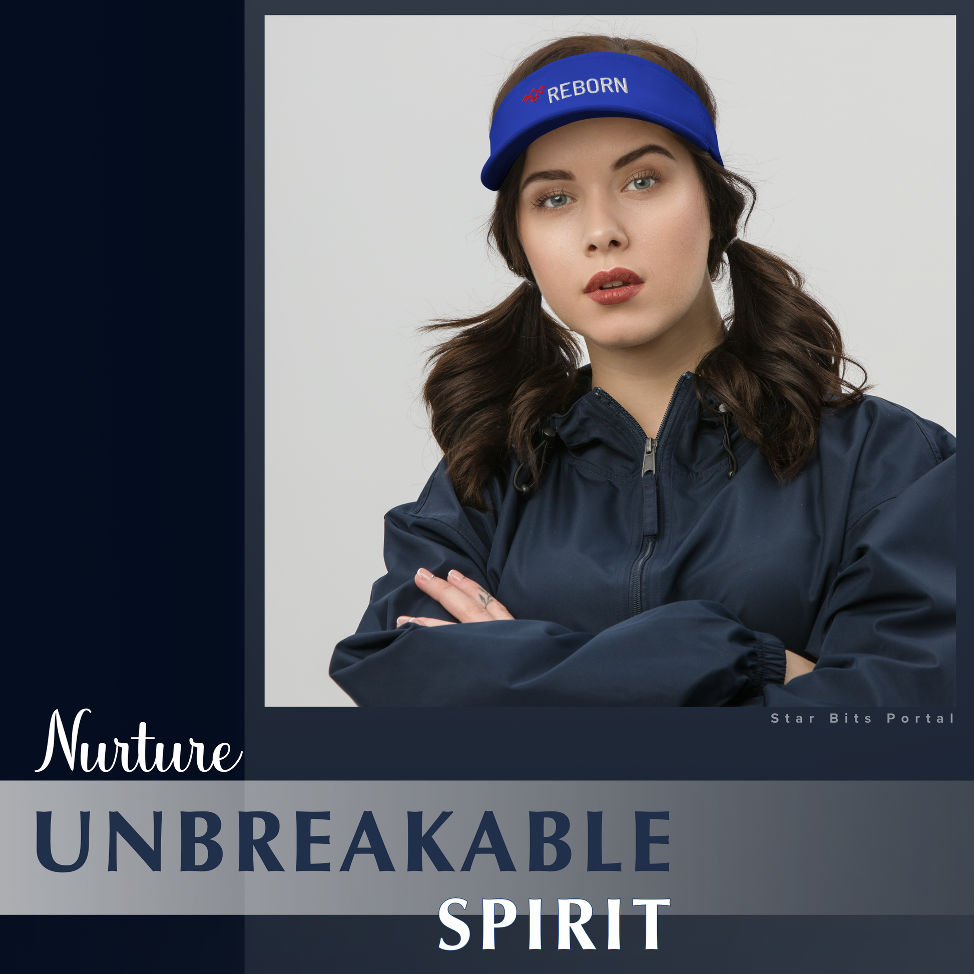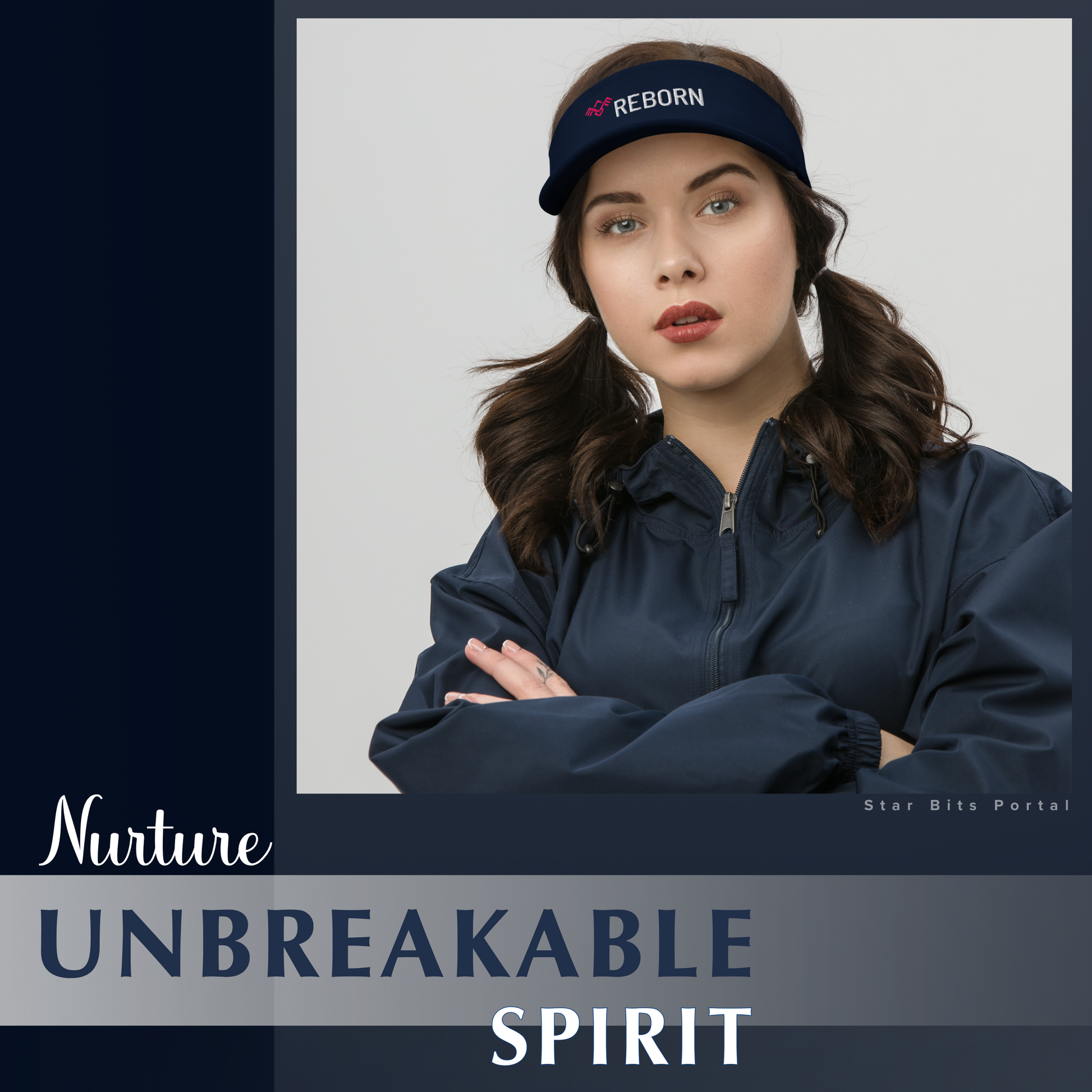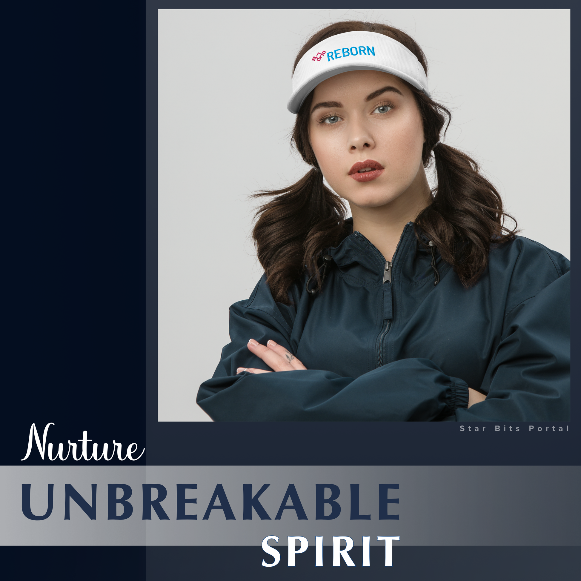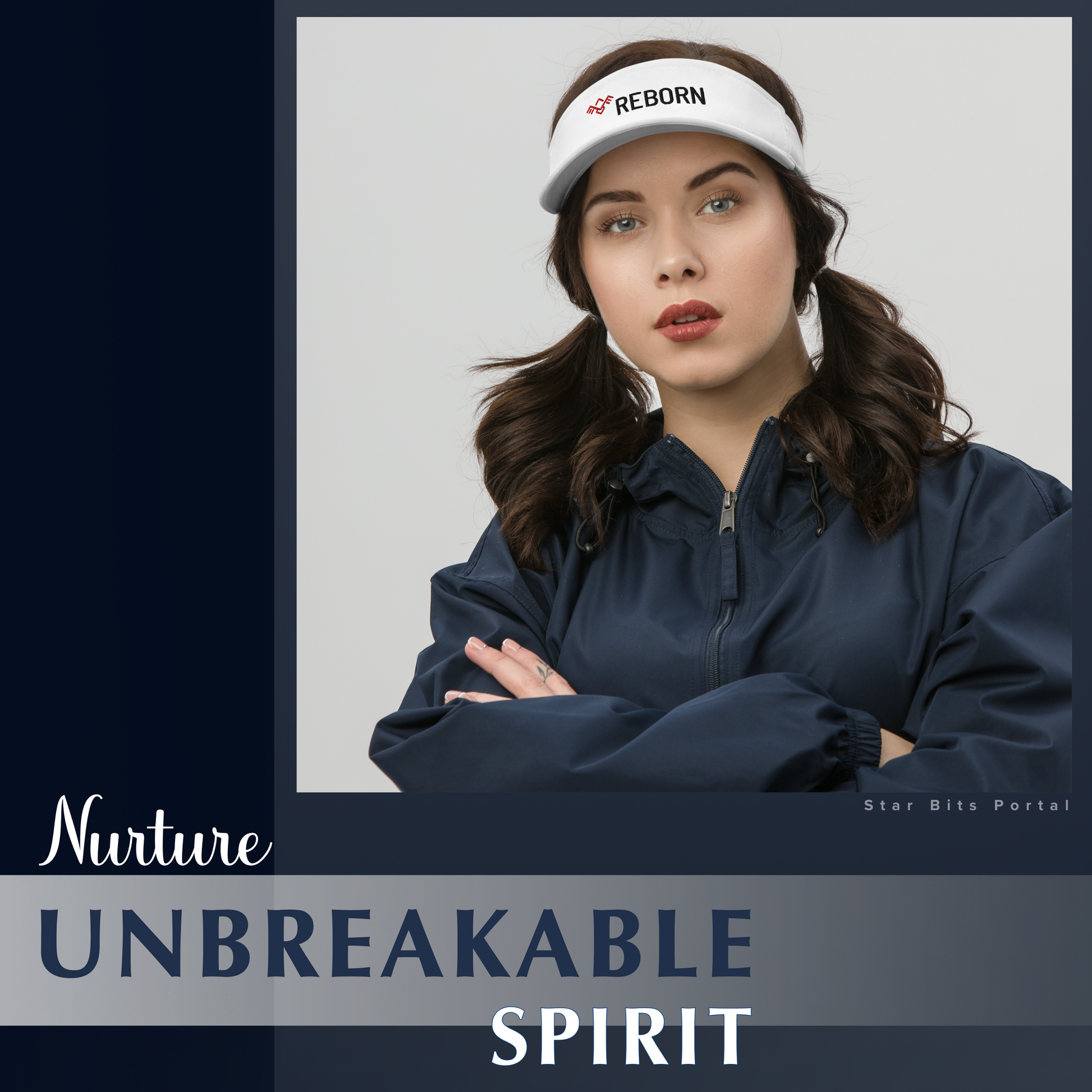 This sleek outdoor visor hat features the empowering word “REBORN" embroidered prominently on the front next to a geometric “Phoenix Symbol”. It serves as a daily reminder of resilience and renewal.