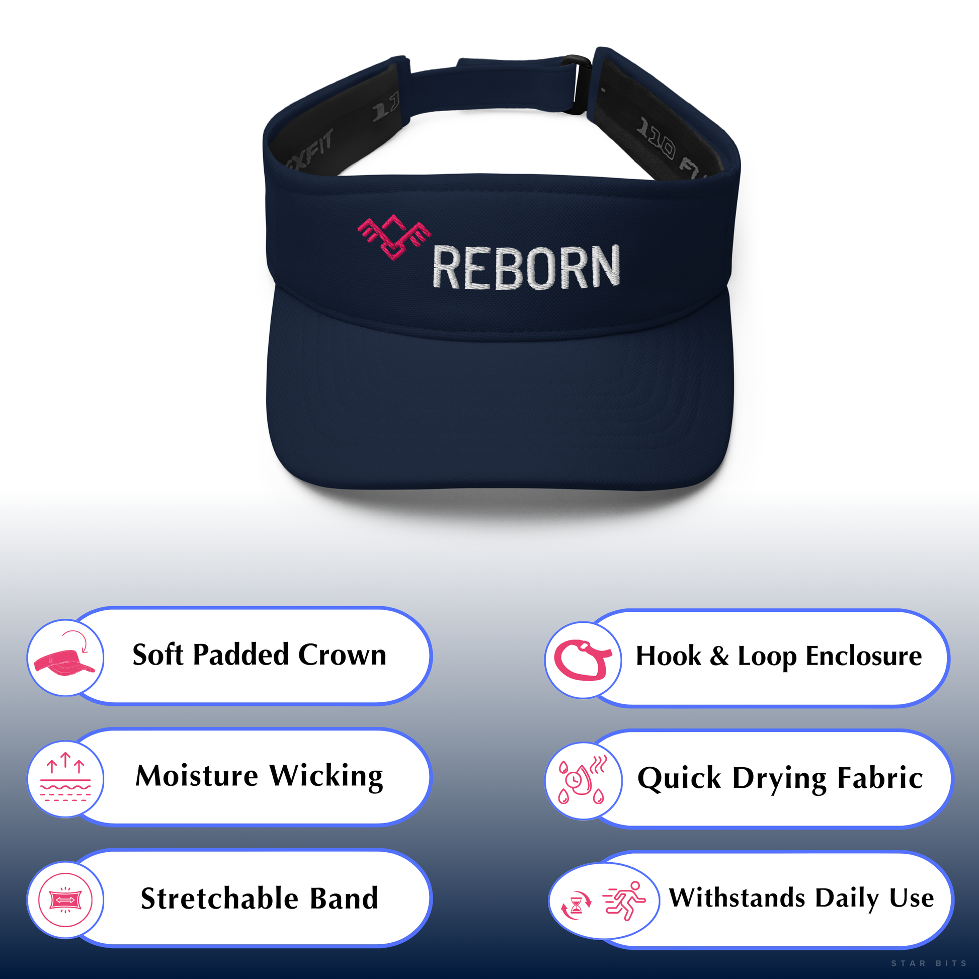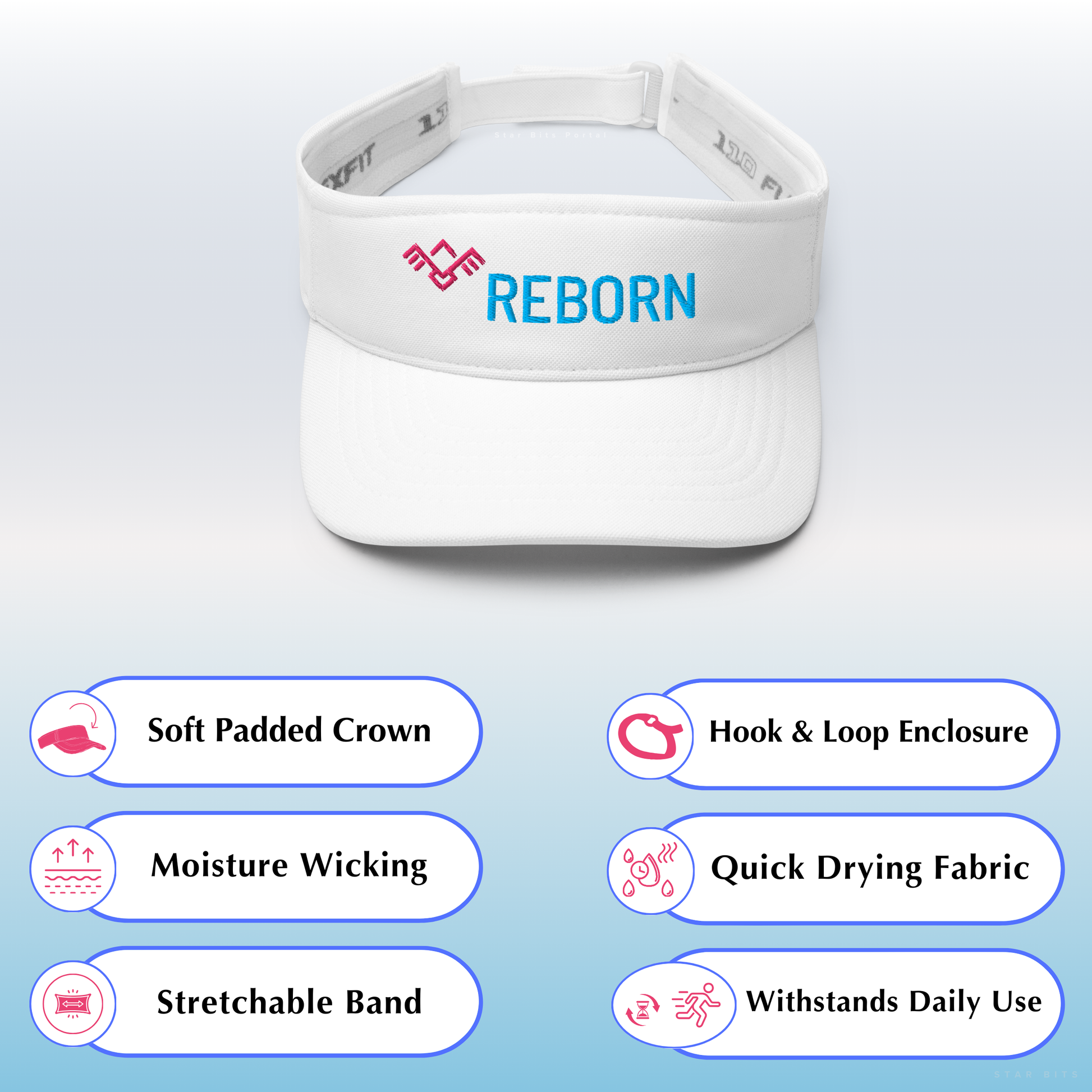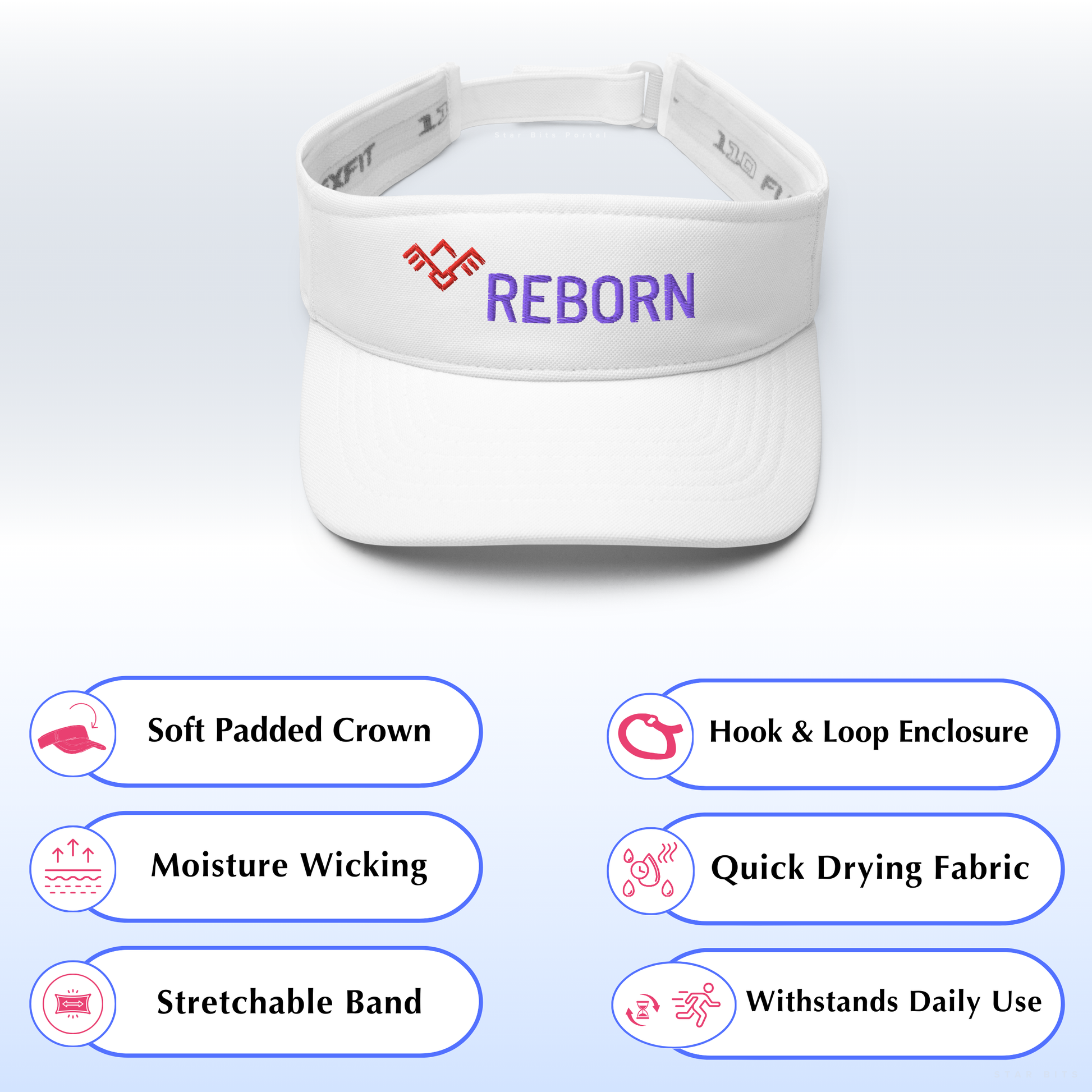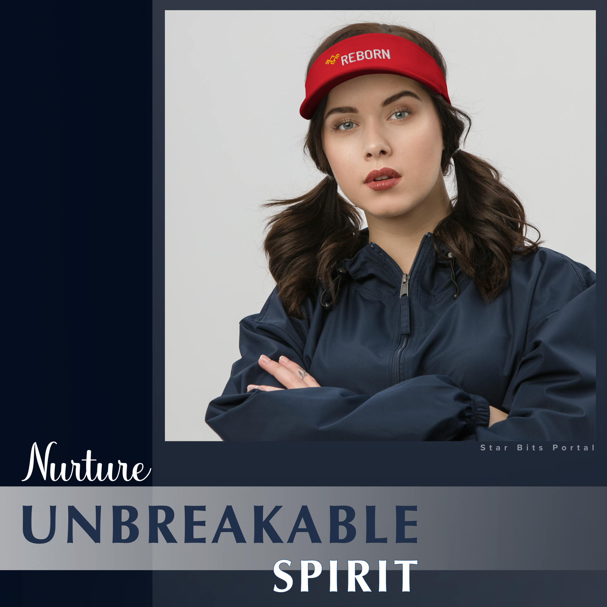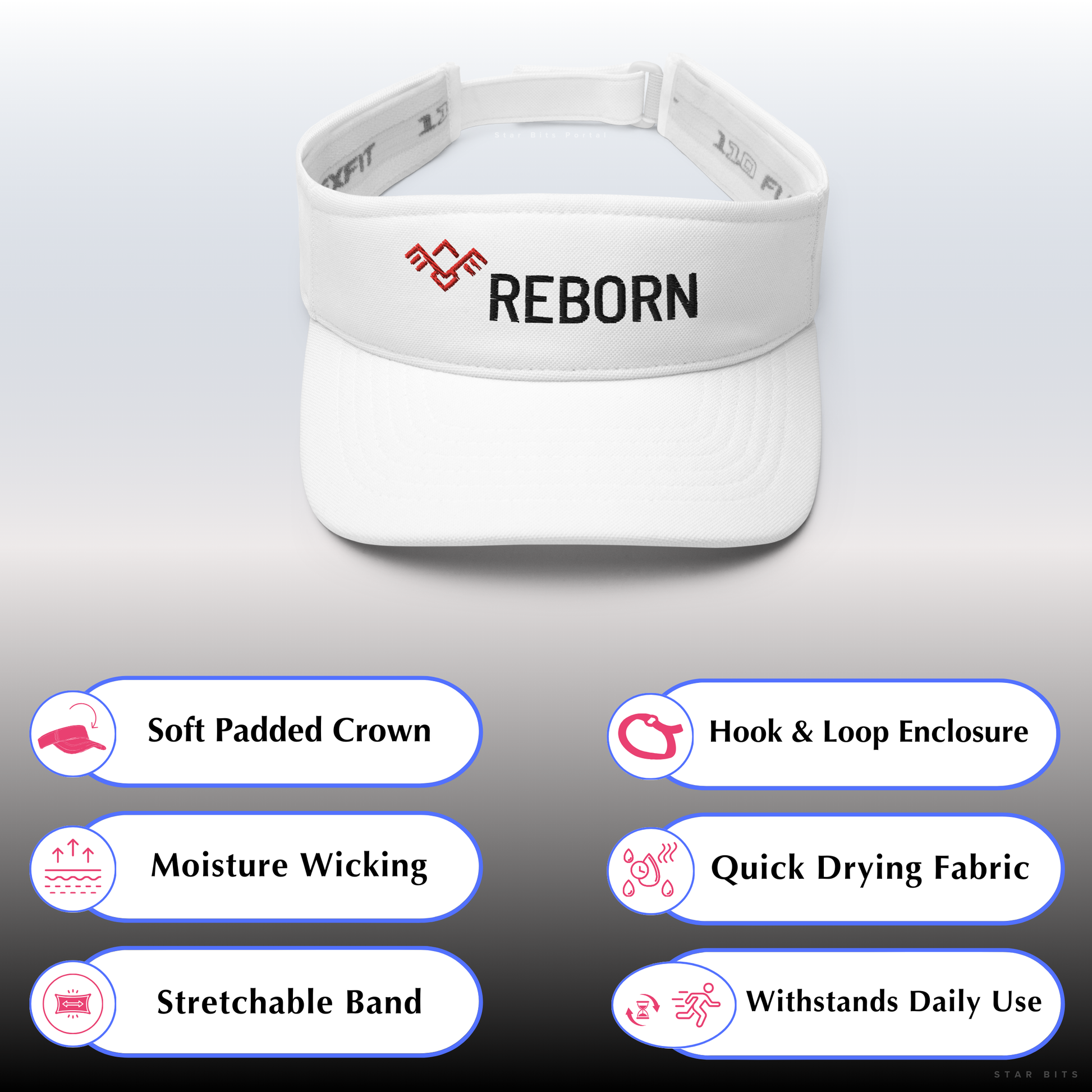 This sleek outdoor visor hat features the empowering word “REBORN" embroidered prominently on the front next to a geometric “Phoenix Symbol”. It serves as a daily reminder of resilience and renewal.